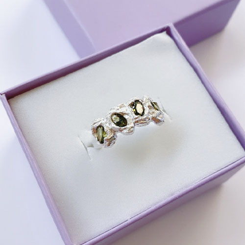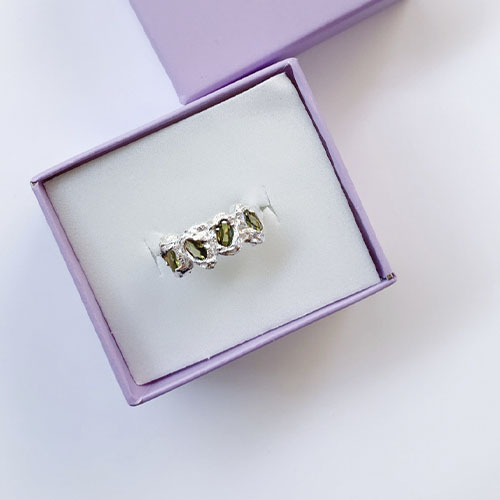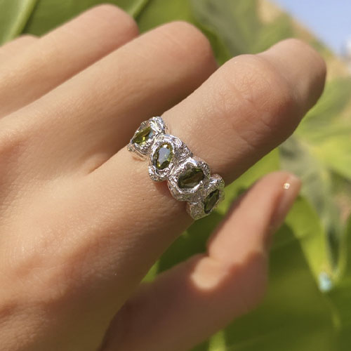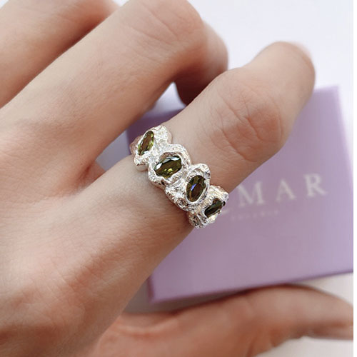 Anillo con zirconias verdes. Fabricado en plata de medida ajustable, se recomienda para tallas para 5 al 8.